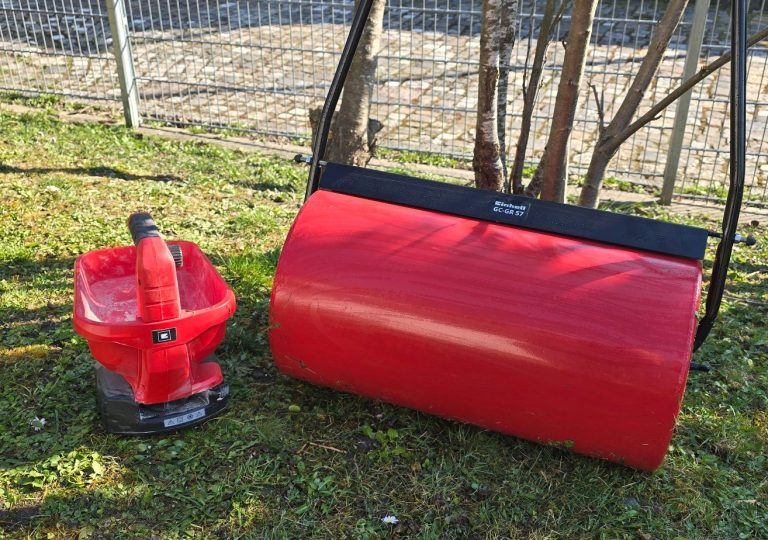 Akku Einhell Streuer für Dünger und Saat. Die Rasenwalze mit Wasserbefüllbar.